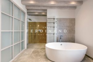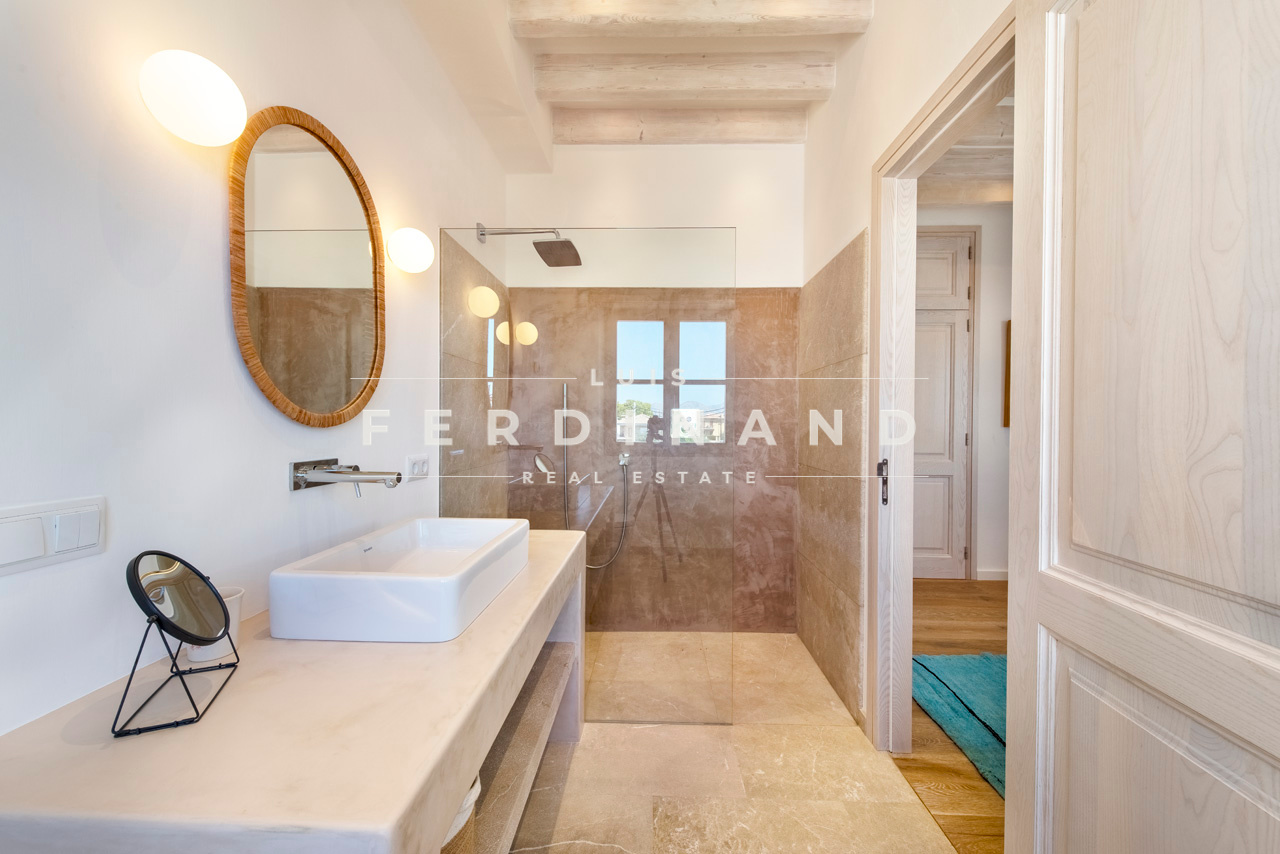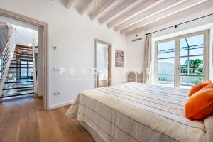 Los acabados interiores destacan por la calidad de los materiales. Los suelos combinan la autenticidad de la piedra mallorquina con acabados abujardado y apomazado en varias zonas, mientras que el salón y los dormitorios de la planta superior aportan calidez con el parquet de roble.