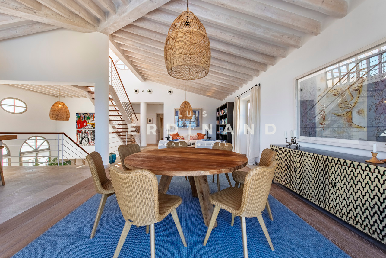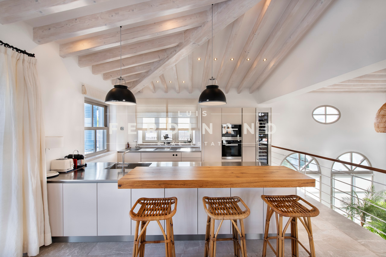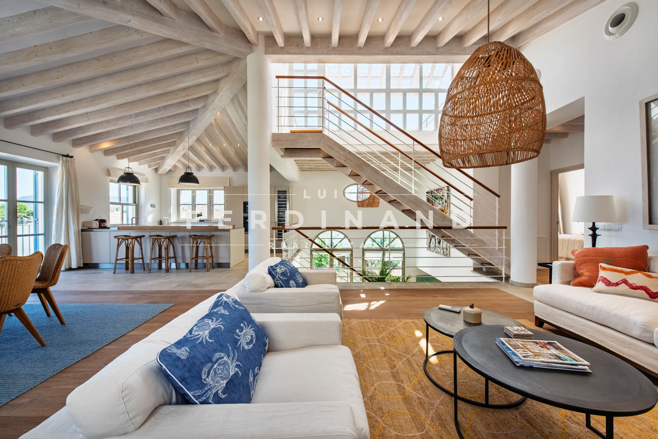 Al entrar, la villa sorprende con un estilo Loft de doble altura en el recibidor, acentuando la sensación de amplitud y luz. Su arquitectura logra una hábil transición de un estilo neoclásico sutil a una estética puramente mediterránea, destacada por el uso de vigas vistas que aportan calidez y autenticidad a los espacios principales.